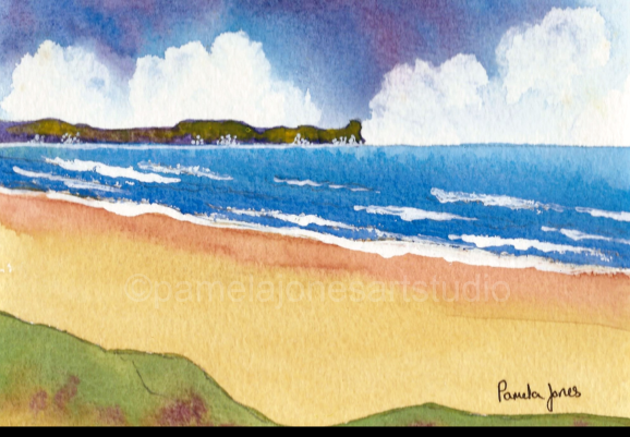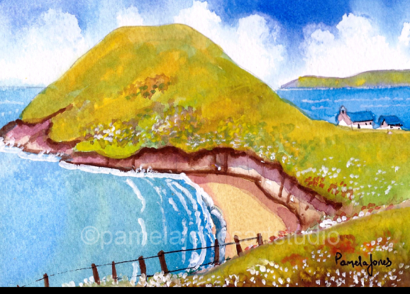 An Original Watercolour :: Mwnt Beach and Little White Church, Cardigan Bay West Wales NEW Size 8 x 6 ins including 1 ins cream mount. Chose Framed or Unframed from the options below! Please select options from the drop down menu below