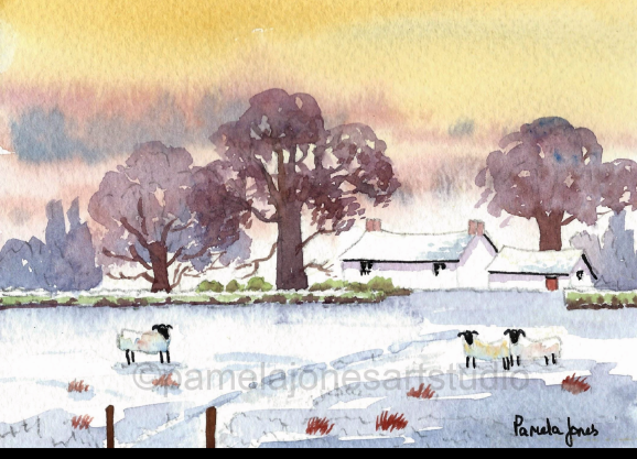 An Original Watercolour :: Snow Scene, Cottage, Sheep. Wales NEW Size 9 ins x 7 ins including 1 ins cream mount. Chose Framed or Unframed from the options below! Please select options from the drop down menu below
